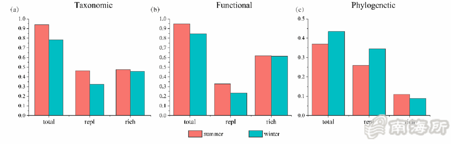 在α多样性方面,南海北部夏季的鱼类分类多样性(species?25 vs.102)、功能多样性(FRic?.51 vs.0.19)以及系统发育多样性(PD?6.27 vs. 15.81)均高于冬季(图3)。在β多样性方面,物种替换(Replacement)对总体β多样性的贡献大于丰富度差异(Richness difference)的贡献(图4),说明季节间群落结构的差异主要由物种替换驱动。结果表明南海北部鱼类在夏季更为丰富和活跃,而在冬季表现出更显著的空间分布差异,如迁移到纬度较低、温度较高的地区过冬。此外,利用水环境和地理环境因素解释了南海北部鱼类α和β多样性的变化:夏季鱼类群落结构更多地受到水环境因素的影响,而冬季则更多地受到地理因素的影响(图5)?/p>