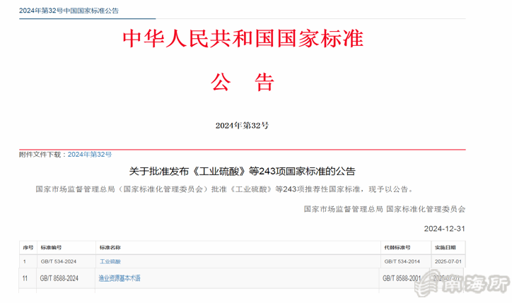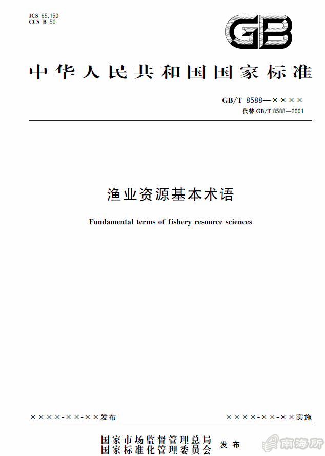 近日,国家市场监督管理总局(国家标准化管理委员会)?024年第32号公告,批准发布了中国水产科学研究院南海水产研究所牵头制定的国家标准《渔业资源基本术语》(GB/T 8588-2024),该标准将?025??日起正式实施?/p>