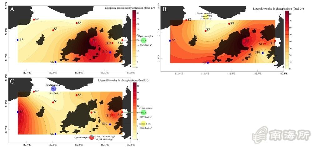 A?/span>B?/span>C分别代表春天、夏天和秋天。等值线表示脂溶性贝类毒素在浮游植物中的分布,不同颜色的圆圈表示牡蛎毒素的零星分?/span>