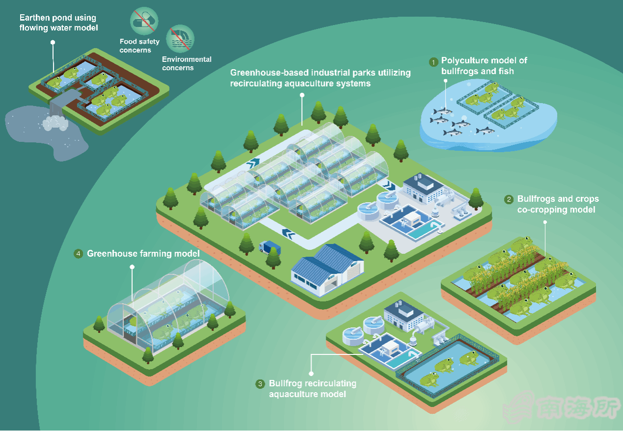 本研究团队借鉴“小棚虾”模式的成功经验,提出以循环水养殖系统(RAS)为核心的产业园区模式,探索“统一服务、独立养殖、严格监管”的绿色发展路径。研究成果系统综述了牛蛙种苗繁育、养殖模式、饲料营养、病害防控和加工利用等研究进展,为我国牛蛙产业的绿色转型发展提供了理论支撑?/p>