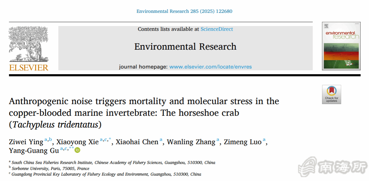 近日,中国水产科学研究院南海水产研究所中华鲎保护科研团队联合院级南海渔业生态环境监测与评价创新团队,以潮间带生态系统健康指示物种中华鲎为对象开展研究,首次发现海上风电运行期水下噪声对中华鲎(Tachypleus tridentatus)幼体的生存、行为和分子水平健康有显著影响,揭示了这一“蓝血古生物”对噪声污染的高度敏感性。相关研究成果以?span style="font-family: "times new roman";">Anthropogenic noise triggers mortality and molecular stress in the copper-blooded marine invertebrate: The horseshoe crab (Tachypleus tridentatus)”为题,发表于国际环境科学权威期刊《Environmental Research》(JCR一区,影响因子7.7,联合培养研究生应紫薇为第一作者,颉晓勇副研究员和谷阳光研究员为共同通讯作者)?/p>