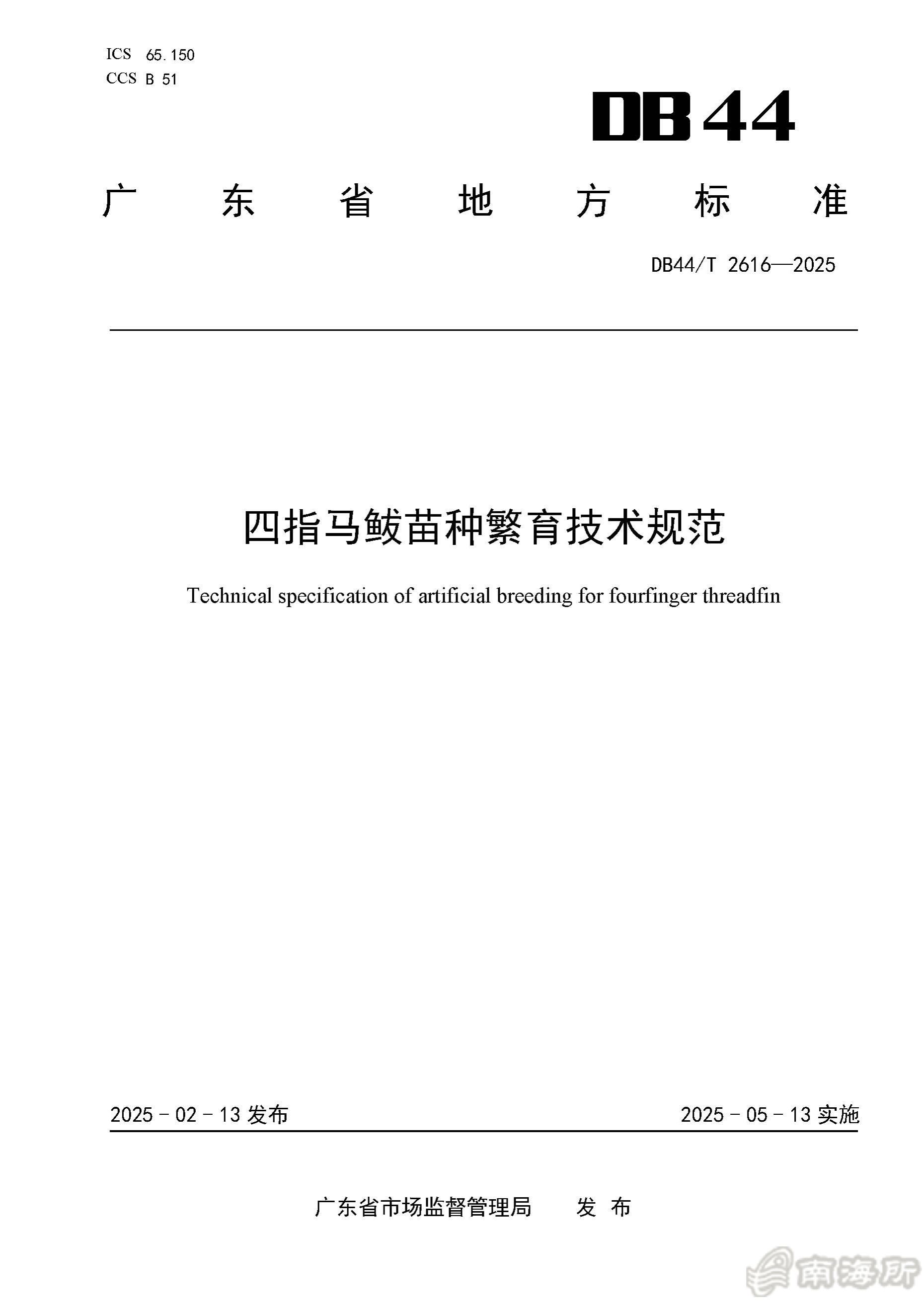 由中国水产科学研究院南海水产研究所区又君二级研究员等牵头制定的广东省地方标准《四指马鲅苗种繁育技术规范》(DB44/T 2616-2025)于2025??3日获批发布并??3日实施。该标准是全国首个四指马鲅的省级以上技术标准,为四指马鲅标准化人工繁殖、育苗、养殖和病害防控及其推广应用提供了规范依据和操作指引?/p>