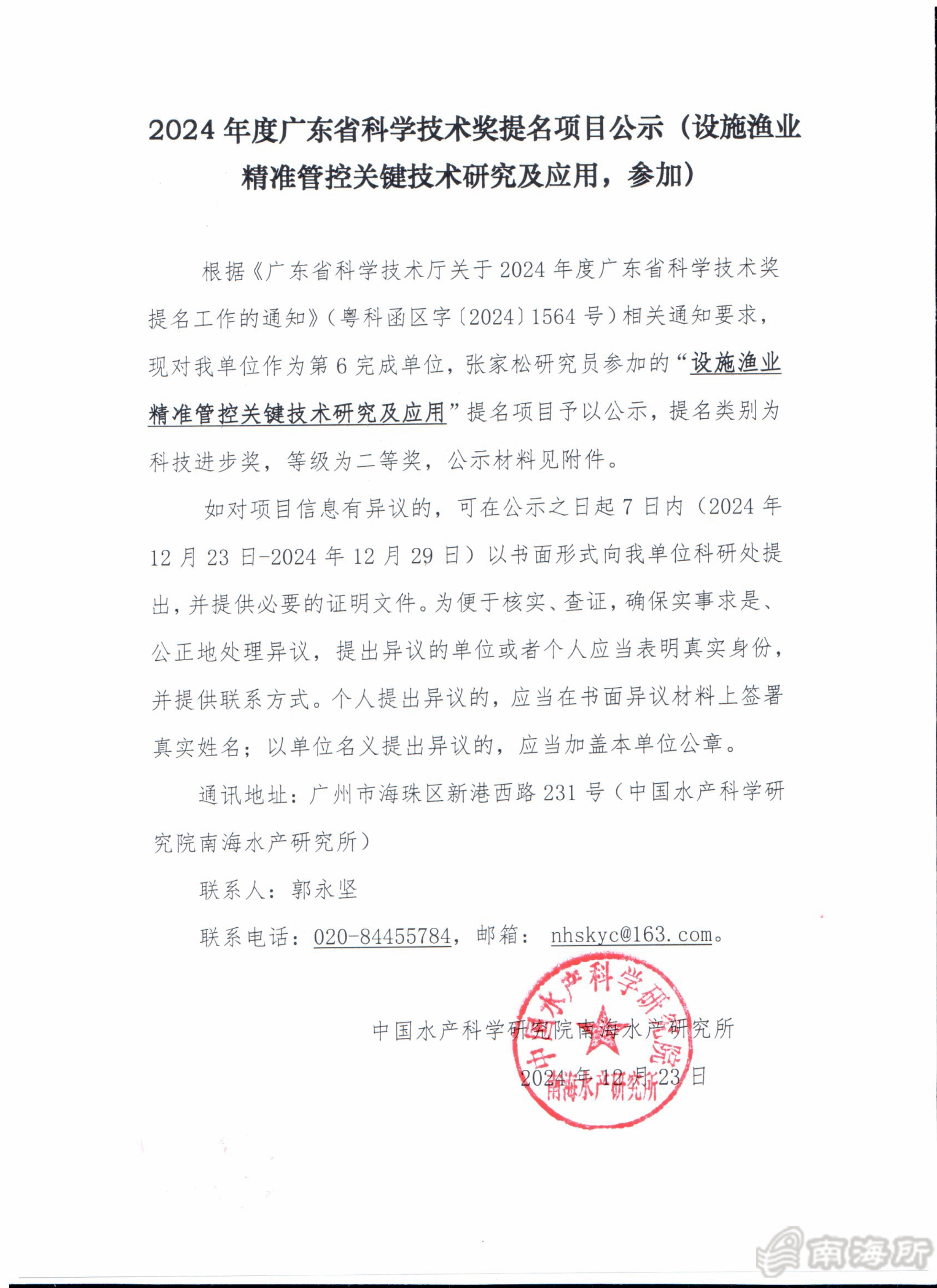 2024年度广东省科学技术奖提名项目公示(设施渔业精准管控关键技术研究及应用,参加)