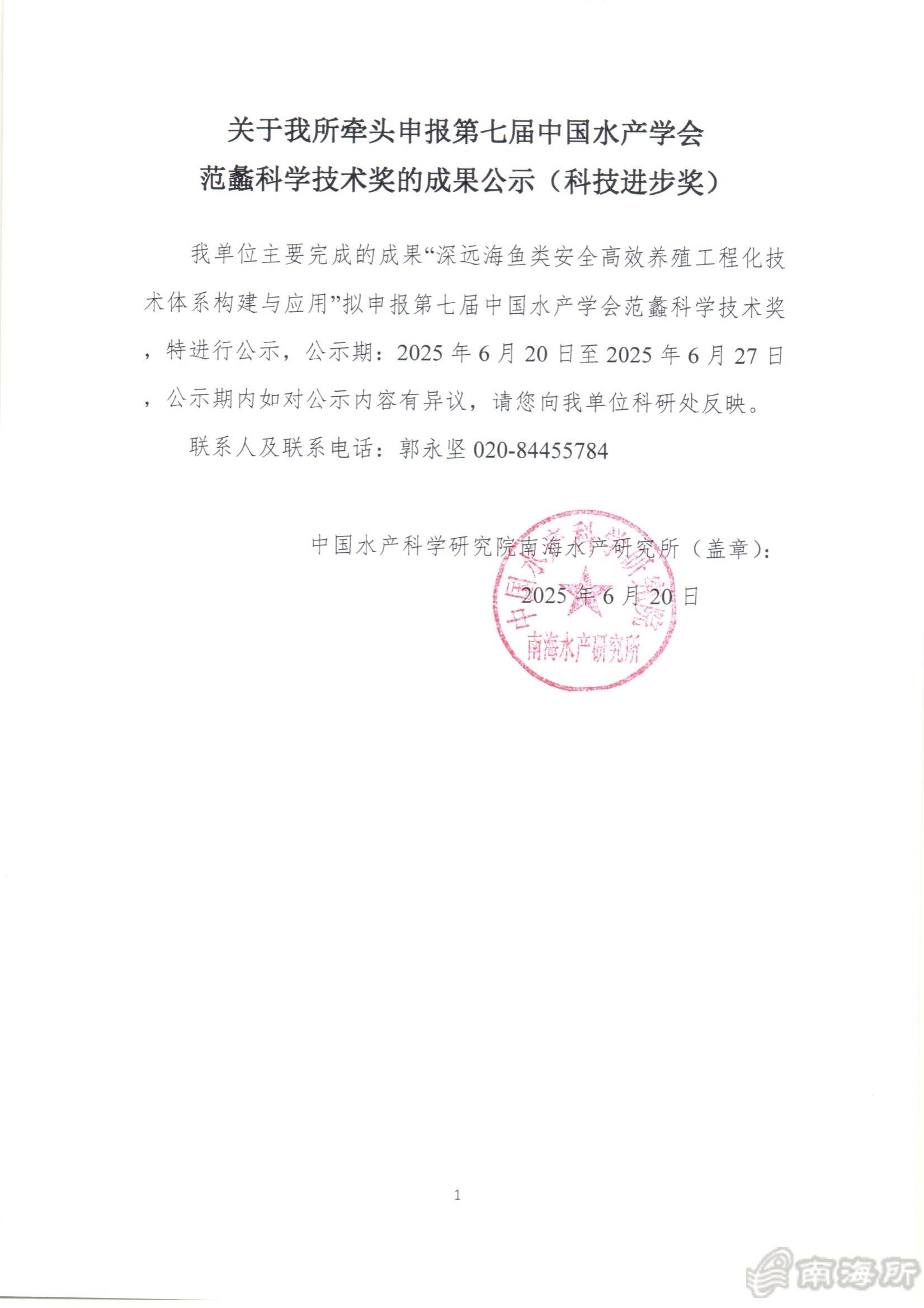 第七届中国水产学会范蠡科学技术奖(科技进步奖)公示材料