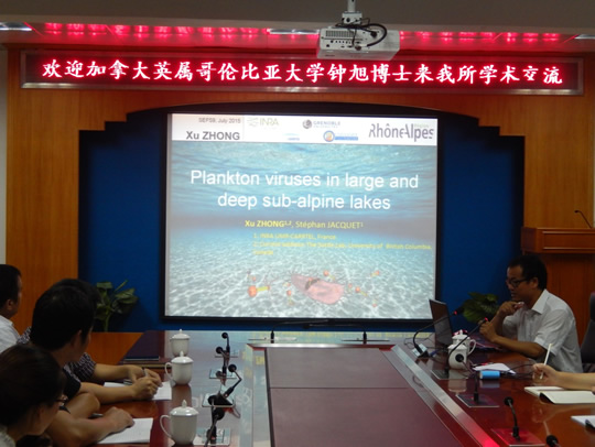 钟旭曾获?013-2014年度欧洲最佳淡水科学博士论文奖。他在会上为大家作了题为“Plankton viruses in large and deep subalpine lakes”学术报告,着重介绍了淡水双链DNA病毒的多样性的研究,阐述了三个欧洲高山湖泊的浮游植物病毒的多样性、群落结构、动态变化、分布和功能作用等。出色的工作和精彩的报告极大地丰富了与会人员对于淡水病毒生态学领域的认识,拓宽了大家的研究思路,引起了积极的互动交流和探讨?/P>