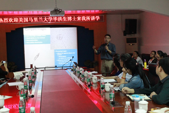 11?7日,美国马里兰大学毕洪生博士应农业部南海渔业资源开发利用重点实验室的邀请到南海水产研究所进行学术交流。南海所副所长李纯厚、渔业生物病害防治研究室副主任冯娟,清华大学深圳研究生院蔡中华教授以及所内相关科研人员和研究生等?0人参加了交流?/P>