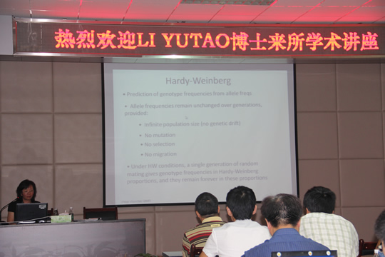 在题为“Introduction to Quantitative Genetics, Genome Wide Association Studies, and Genomic Selection”的讲座中,LI YUTAO 博士分别对经典数量遗传学、全基因组关联研究和基因组选择育种的统计分析原理、分析方法和应用实例进行了系统、深入的介绍,并就一些研究心得、体会与大家进行了交流。讲座内容丰富、精彩,引起了大家的浓厚兴趣,发言踊跃,讨论热烈,交流广泛?/P>