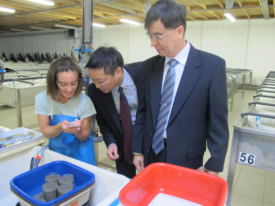 考察组参观了该公司三倍体苗种的生产车间及其工艺流程,出海察看了牡蛎海上养殖情况,现场品尝了法国生蚝。王江勇研究员还仔细询问了其各个环节的技术问题以及目前牡蛎苗种孵化、生长到出售等成本及市场行情,了解到欧洲许多国家商品牡蛎的生产由于受病毒影响,绝大部分出现了死亡,但该公司生产的蚝苗及成品则没有出现死亡,并就其原因与对方技术人员进行了交流?/P>