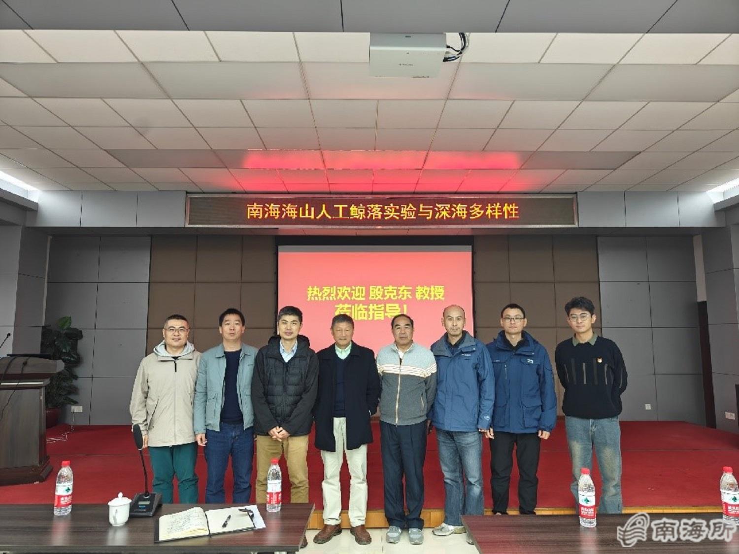 会上,殷克东教授作了题为“南海海山人工鲸落实验与深海多样性”的学术报告。他以南海首次发现的鲸落为切入点,深入浅出的介绍了世界鲸落研究的最新进展以及海山生态系统的独特性,创造性地开启了南海海山人工鲸(牛)落实验,生动还原了南海鲸落海洋生物的自然演替以及空间差异,深入探究了南海鲸落的生态容量;报告还展示了珍贵的南海深海海洋生物监测视频,为大家揭开了南海深海海洋生物的神秘面纱。此次学术交流为与会人员开展原创性科研工作提供了有益的借鉴和启示,引发了大家的浓厚兴趣和热烈讨论?/p>