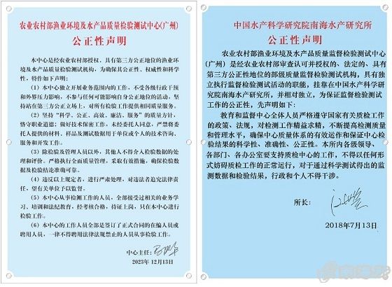中心拥有国家级资质认定(CMA,证书有效期2020?月日-2026??日)、农产品质量安全检测机构考核合格(CATL)资质,是绿色食品和地理标志农产品的定点检测机构,也是国家食品复检机构、农业农村部和广东省水产品复检机构。中心工作场所面积2400平方米,配备液相色谱串联质谱仪、气相色谱串联质谱仪、电感耦合等离子体质谱仪等大型检测仪器设?0余台套,检测技术能力授?27个产品?27个参数,可承接水产品、渔业环境、渔业投入品、水产饲料、水产食品和水产种质等产品的检验检测业务,向社会提供具有证明作用的数据和结果。中心严格遵守法定要求、独立公正从业、履行社会责任、严守诚实信用原则,开展检验检测工作?/p>