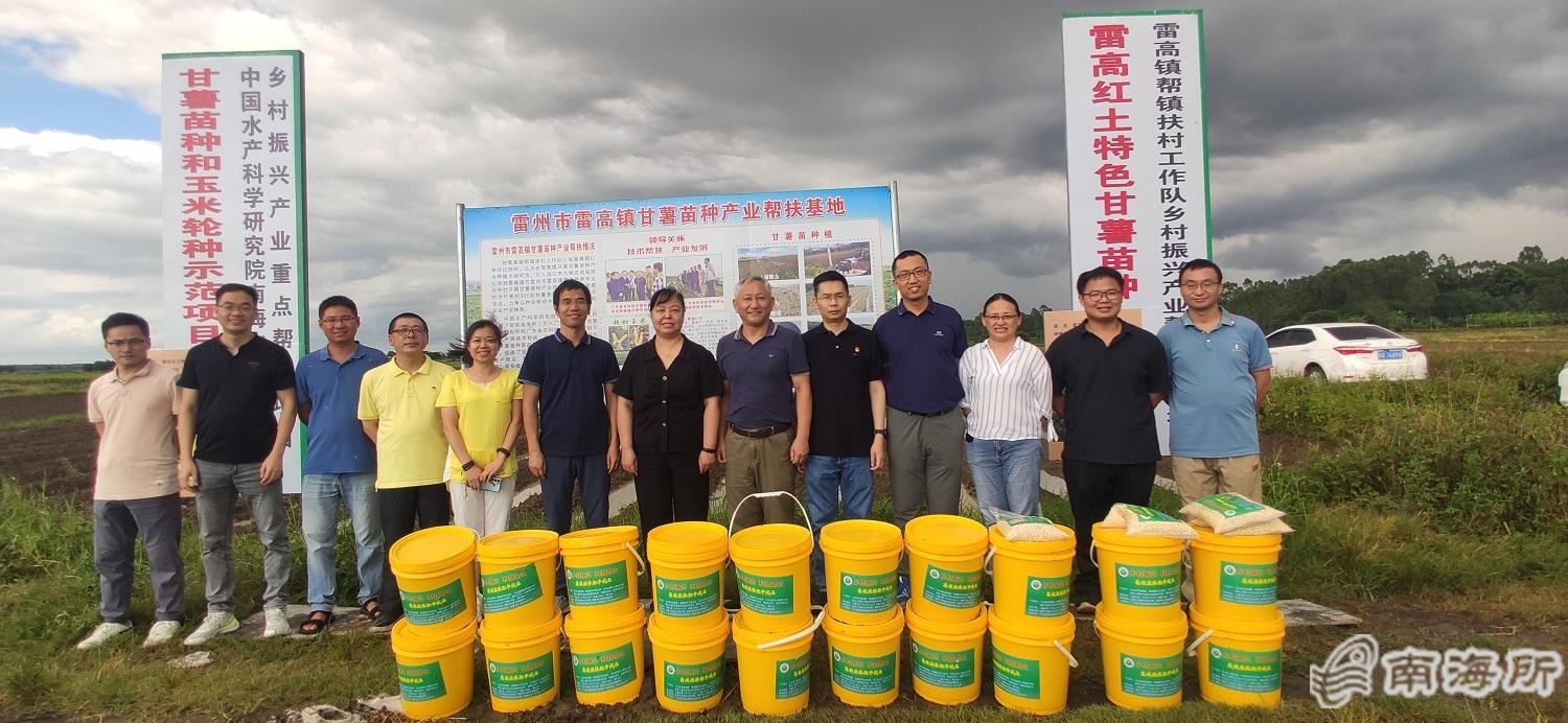 在雷高镇肖家村甘薯苗种示范基地,南繁所吴嘉云副所长一行向雷州市雷高镇荣丰种养专业合作社捐赠了一批甘薯苗种、玉米种子以及优质液体肥料等,助力南海所乡村振兴帮扶的“雷高镇甘薯苗种和玉米轮种示范项目”提档升级?/p>