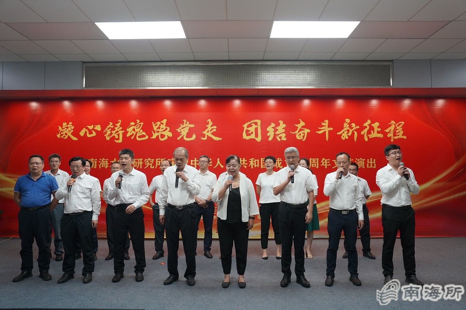 特别值得一提的是,离退休同志带来的舞蹈《祖国,你好》和联培学生的独唱《岁月神偷》,不仅展现了不同年龄层南海所人对祖国的热爱,也体现了南海所的科研文化传承。最后,所领导、“两委”委员及各部门负责人的合唱《歌唱祖国》将整场演出推向了高潮,全体演出人员和观众共同唱响了对祖国的赞歌?/p>