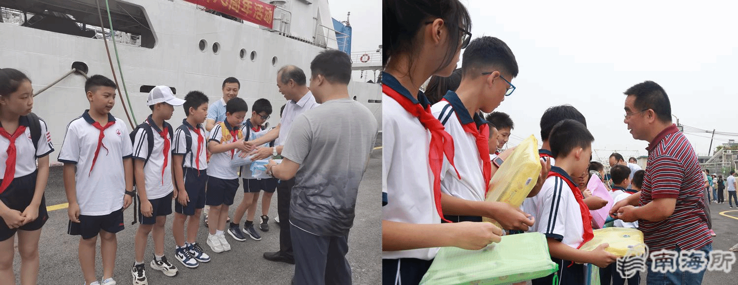 登上“南锋”号科考船,南海所调查船基地成员化身科考船 “红领巾讲解员”,结合一线科考经验,向师生们和家长们科普我国海洋渔业知识,讲述其开展海洋科学研究、维护我国海洋渔业权益的故事。现场还给学生们发放了文具用品和海珠区少先队校外实践活动特色章?/p>