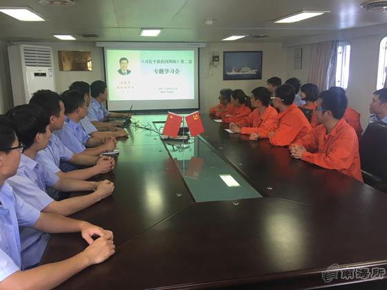4?0日,正在我国南沙群岛海域执行农业农村部“南锋专项Ⅱ期”调查任务的“南锋”号调查船召开全体党员大会,成立海上临时党支部,并着重就宣传贯彻党的十九大精神、习近平新时代中国特色社会主义思想、《习近平谈治国理政》第二卷开展专题学习?/p>