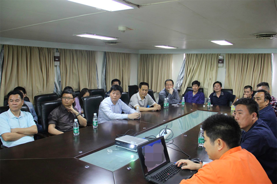 在船上会议室,航次首席科学家陈作志汇报了该航次调查任务执行情况。陈水胜代表所领导班子对全体科考队员圆满完成任务、胜利凯旋表示热烈祝贺和亲切慰问,对他们表现出的不怕艰苦、团结协作、勇于奉献、严守纪律的精神风貌给予了充分肯定,对取得的一系列重要成果特别是南沙部分岛礁潟湖区渔业综合调查成果给予了高度评价,并要求全面总结本航次工作,认真分析存在的不足,为执?016年后续科考任务做好充分准备?/p>