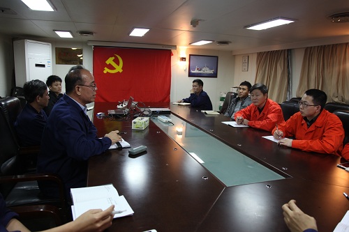 3?0日,正在南海中部海域执行渔业资源和生态环境调查任务的中国水产科学研究院南海水产研究所渔业科考队召开全体党员大会?014年第1航次海上总指挥、南海所副所长李来好出席会议并讲话,“南锋”号调查船政委欧树正主持会议?