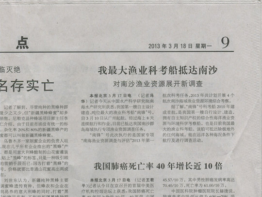 3?7日,经过海上8天连续航行,中国水产科学研究院南海水产研究所“南锋”号渔业科学调查船抵达南沙海域,开始执行“南海渔业资源调查与评估”专项调?013年第1航次调查任务。此举标志着我国启动对南沙渔业资源的新一轮调查?/p>