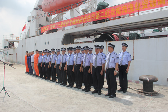 在欢送仪式上,刘新中代表所党政领导班子讲话,他首先强调了此次深入开展南沙海域渔业资源调查的重要意义,着重指出在当前全国人民高度关注国家海洋维权、党中央国务院高度重视海洋渔业发展特别是南海渔业发展的背景下,执行好2013年第2航次渔业资源调查任务,并举行维护海洋权益系列活动,在进一步掌握我国南沙传统海域渔业资源情况、为指导南沙渔业生产提供科技支撑的同时,还将发挥重要的屯渔戍边、宣誓主权的作用。他要求,全体船员和科研人员要讲大局、讲政治,把这次科考作为一项政治任务来完成好;要讲团结、讲合作,密切配合,同心同德,既执行好既定科考工作方案,也要充分估计可能发生的各种突发情况,细化各项工作预案,落实好各项措施;要讲纪律、讲安全,一切行动听指挥,加强各方面的沟通协调,遵守各项规定,确保航行安全、通讯安全、信息安全、人员安全、财产安全。最后,他重申,全体人员要始终做到没事不惹事,有事不怕事,努力做好自己的事,并预祝这次调查取得丰硕成果,凯旋而归?/p>