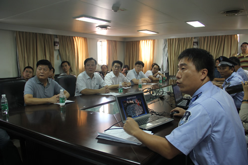 举行欢迎仪式前,在“南锋”号科考船上召开了南沙海域渔业资源及生态环境调查情况汇报座谈会,听取了本航次科考有关情况的工作汇报。江世贵所长作总结讲话,他充分肯定了此次科考工作的完成情况,认为本航次无论是科考工作,还是组织管理工作都非常出色,非常成功。他强调,要进一步加强南海渔业资源与生态环境调查工作,充分发挥“南锋”号科考船海上科学研究平台作用,为推进南海渔业科技事业、维护国家海洋权益、保障渔业生产安全作出新的更大贡献?/p>