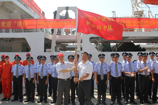 启航仪式上,张显良为南海所渔业科考队授旗,江世贵宣布“南锋”号渔业科学调查船赴南沙海域开展渔业资源及生态环境调查启航?/p>