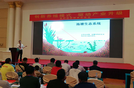 此次交流培训会由广东恒兴饲料实业股份有限公司主办,旨在积极推动鱼虾混养模式推广和广大客户创造效益。重点实验室朱长波博士针对当前鱼虾混养模式现状,在大会上作了题为“对虾生态养殖技术与模式”的专题报告,对池塘生态和物质循环理论、生态养殖的技术要点及多种新型的鱼虾混养模式进行了详细讲解,并和重点实验室其他专家一起与养殖户们进行互动交流,现场解答大家在养殖过程中遇到的技术难题。