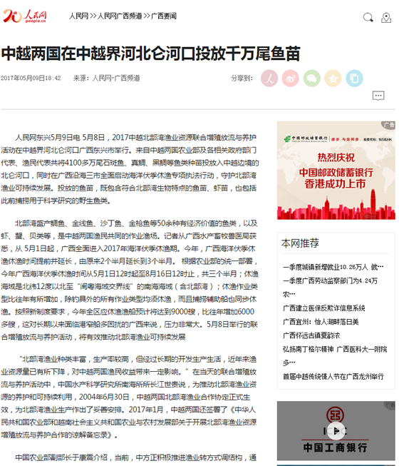 人民网:中越两国在中越界河北仑河口投放千万尾鱼苗