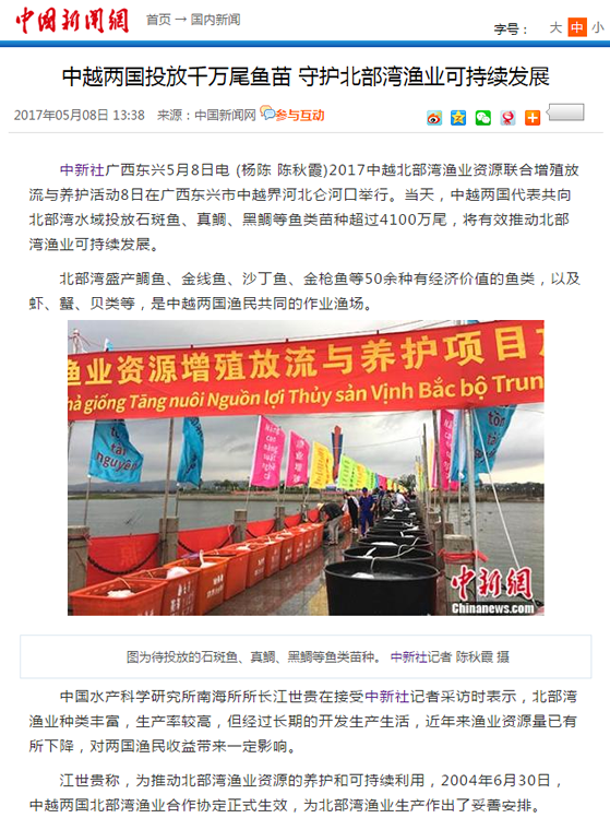中国新闻网:中越两国投放千万尾鱼苗 守护北部湾渔业可持续发展