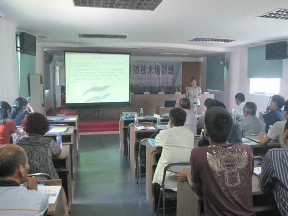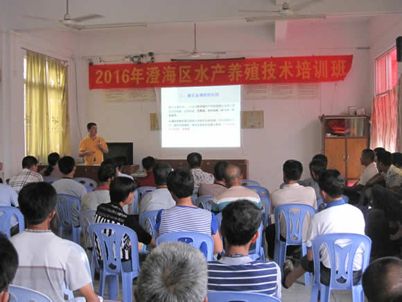 2016年5月13日至14日,重点实验室科研人员李卓佳研究员、杨铿助理研究员一行,应广东省汕头市澄海区海洋与渔业局邀请,在澄海区盐鸿镇和溪南镇等地开展对虾养殖技术培训,共有来自当地的基层技术推广人员和养殖户180多人参加了培训。 培训班上,李卓佳、杨铿分别作了题为“南美白对虾池塘养殖技术”、“对虾养殖环境调控剂与应用技术”的指导讲座,并就当地对虾养殖过程出现的实际问题与养殖户们进行热烈交流,答疑解难。此次活动向养殖户赠送对虾养殖技术资料300多份。