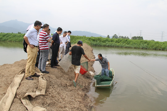 2015年8月20日,广东省海洋与渔业技术推广总站组织专家对实验室承担的斑节对虾杂交新品系选育工作情况进行了现场测试验收。 验收专家组听取了斑节对虾选育情况汇报,查阅了试验和养殖生产的原始记录和相关资料,并在台山市都顺渔业养殖专业合作社的莘村亦丰围对虾养殖场,对斑节对虾选育杂交新品系进行了包括表型性状数据、生长速度及成活率等多指标现场测试。验收专家组经质询和讨论,一致同意“斑节对虾选育杂交新品系生长测试”通过现场验收。