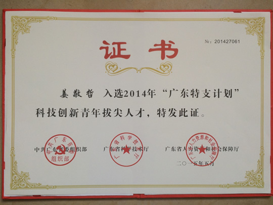 日前,广东省公布了2014年“广东省培养高层次人才特殊支持计划”(简称“广东特支计划”)各项目入选人员名单。实验室科研人员姜敬哲博士入选2014年“广东特支计划”科技创新青年拔尖人才,同时获得专项经费资助。