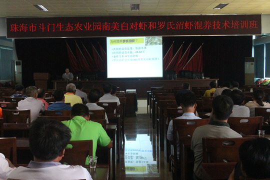 2015年5月31日,珠海市斗门生态农业园南美白对虾和罗氏沼虾混养技术培训班在白焦镇举办,园区有关领导和业务负责人、白焦镇水产企业技术人员、对虾养殖户等150多人参加了培训。实验室朱长波博士应邀为培训班授课。