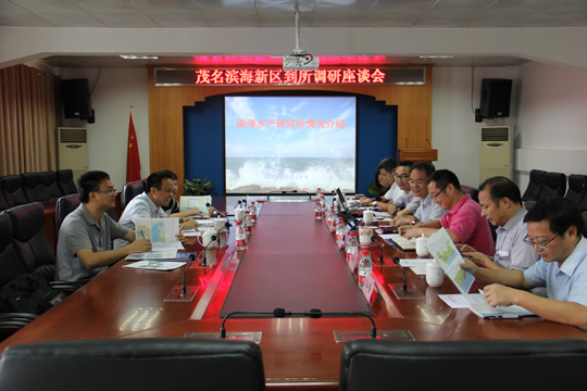 2015年6月24日,茂名滨海新区党工委副书记、管委会副主任陈研一行3人,到重点实验室进行考察调研。重点实验室主任李纯厚研究员接待了陈研一行,双方就加强新区现代渔业建设相关工作开展了座谈交流。