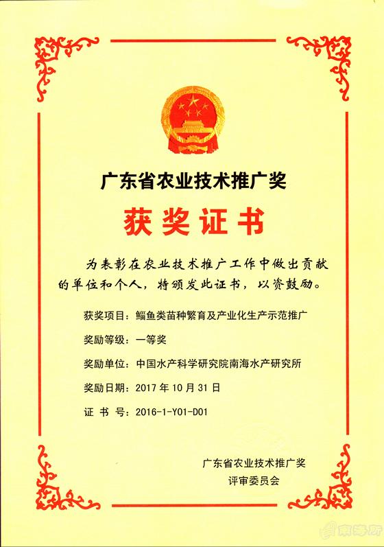 近日,广东省农业技术推广奖评审委员会对2017年评审的2016年度广东省农业技术推广奖获奖项目颁发证书,其中一等奖11项、二等奖36项、三等奖44项。重点实验室区又君研究员主持完成的“鲻鱼类苗种繁育及产业化生产示范推广”项目荣获广东省农业技术推广奖一等奖并获荣誉证书。