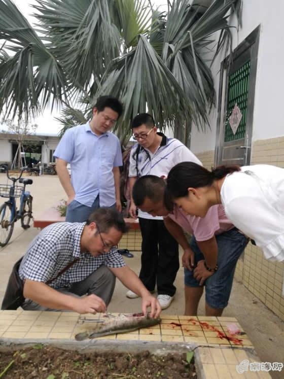 重点实验室专家组与各养殖企业技术员、养殖户进行深入交流,仔细询问灾前、灾后对养殖池塘鱼所采取的防护措施、饲料投喂、使用药物(或生物制剂)等情况,认真为养殖企业问诊把脉,对症下药,为受灾企业解决灾后渔病防治的养殖难题。其中,在乾务强竞公司养殖场,专家组有针对性提出继续做好养殖池塘配套设施、把进水口和出水口区分开、做好水体消毒、内服增强营养免疫的添加剂、对影响较大的池塘进行修补和补苗、做好鱼塘藻相和菌相的培养、稳定水质等措施建议;在斗门嘉宜、金湾年丰等企业,专家组现场讲解了指环虫感染和诺卡氏菌病缺少合适的治疗方法和手段,以及鲫鱼和鮰鱼养殖过程调水方法以及pH、磷酸盐和氨氮对养殖鱼的影响等内容。王江勇、徐力文等专家为了更准确诊断鱼病,还现场解剖病鱼,向养殖户介绍鱼病特点和诊状,传授治疗的方法与措施。