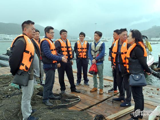 近日,广东省农业农村厅港澳流动渔民工作处处长陈文、深圳市港澳流动渔民工作办公室主任侯克强、香港渔民互助社会长林根苏、香港渔民团体联会副主席杨上进等一行9人,就粤港澳大湾区建设背景下促进港澳流动渔民网箱养殖及休闲渔业发展等事宜,到重点实验室深圳试验基地交流调研,并现场考察基地科研设施和海上深水抗风浪网箱。深圳基地主任林黑着、副主任黄忠等接待了陈文处长、林根苏会长一行。