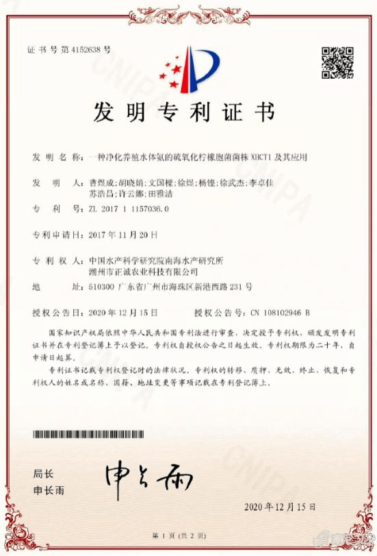 近日,由农业农村部南海渔业资源开发利用重点实验室曹煜成、胡晓娟、文国樑等发明的“一种净化养殖水体氨的硫氧化柠檬胞菌菌株XHCT1及其应用”获国家发明专利授权,专利号为:ZL201711157036.0。该菌株现保藏于中国典型培养物保藏中心,保藏编号CCTCC:M2017436。
