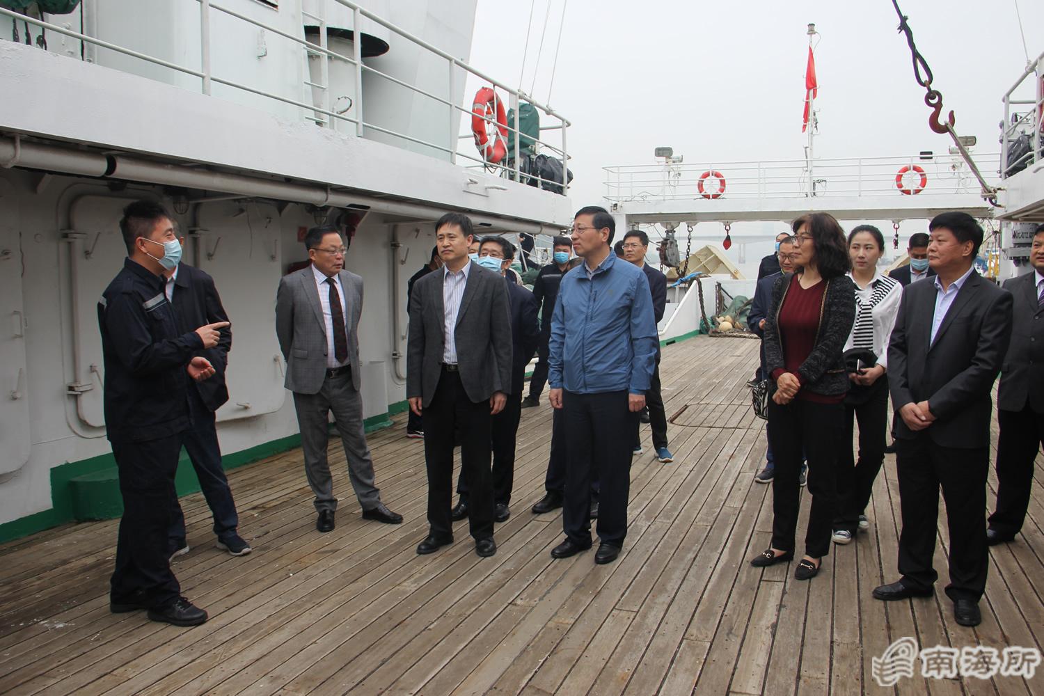 洪亮司长、刘新中局长一行在南海所所长江世贵、党委书记徐竹青等所领导陪同下,参观了南海所调查船基地和南海渔业中心,了解了“南锋”号调查船基本情况和近年来赴南海执行科考任务情况,听取了南海渔业中心有关南海渔船船位监控系统、中国渔政执法举报受理平台等运行情况的工作汇报。