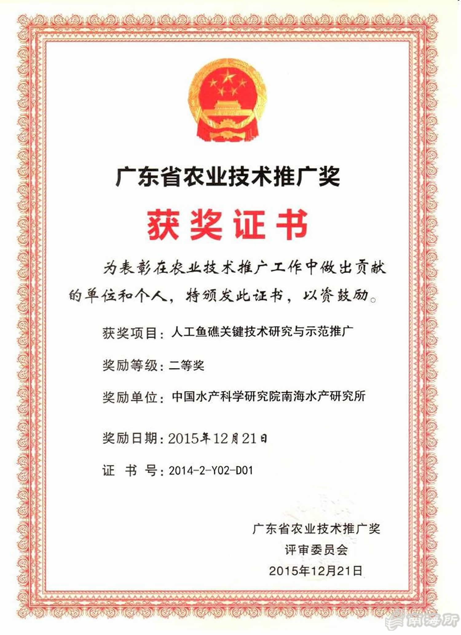 “人工鱼礁关键技术研究与示范推广”获2014年广东省农业技术推广奖二等奖?/p>