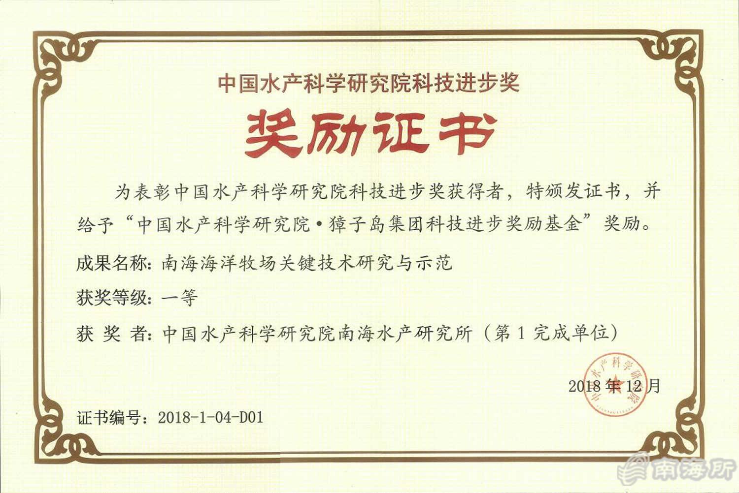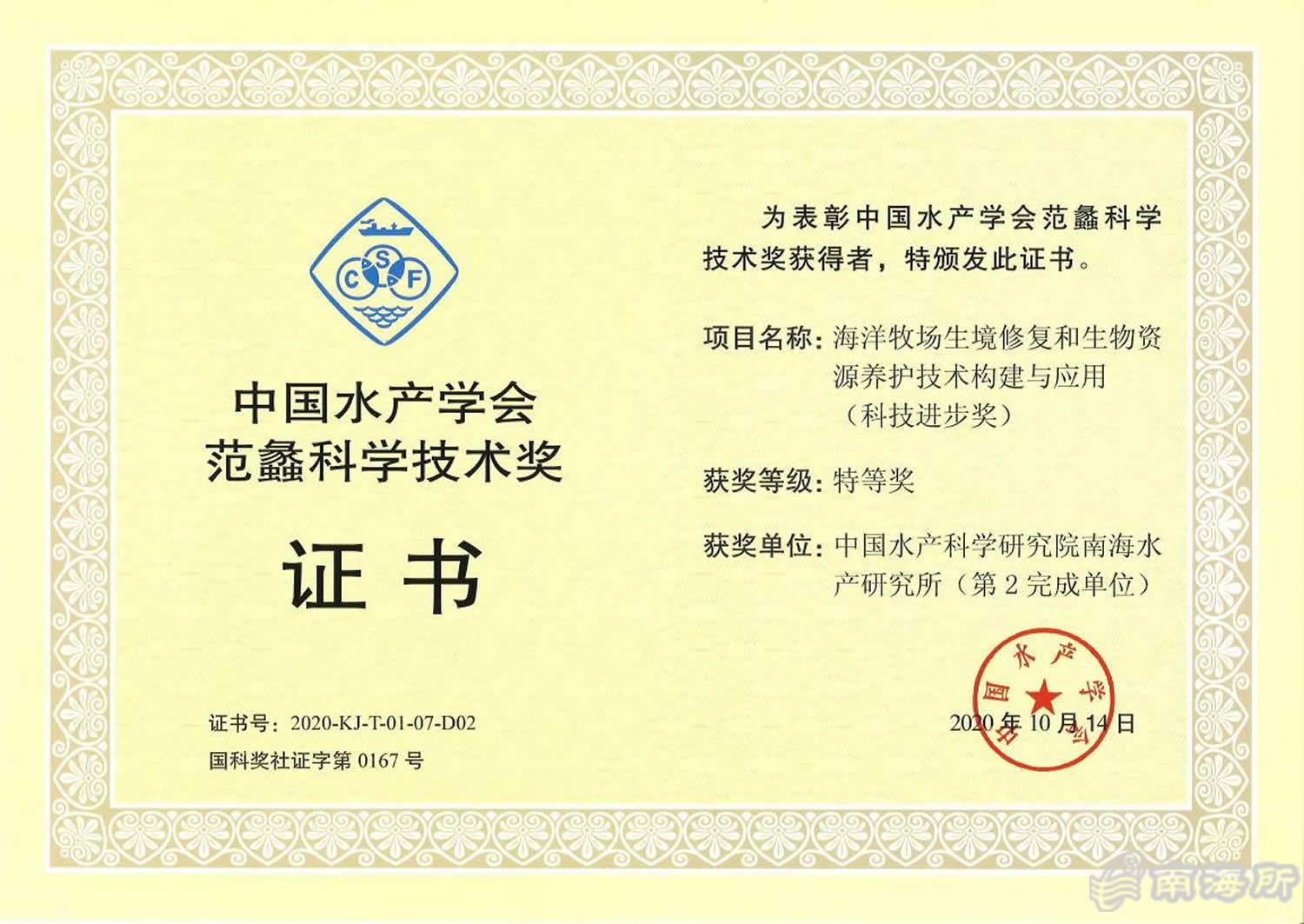 “南海海洋牧场关键技术研究与示范?018年获中国水产科学研究院科技进步一等奖?/p>