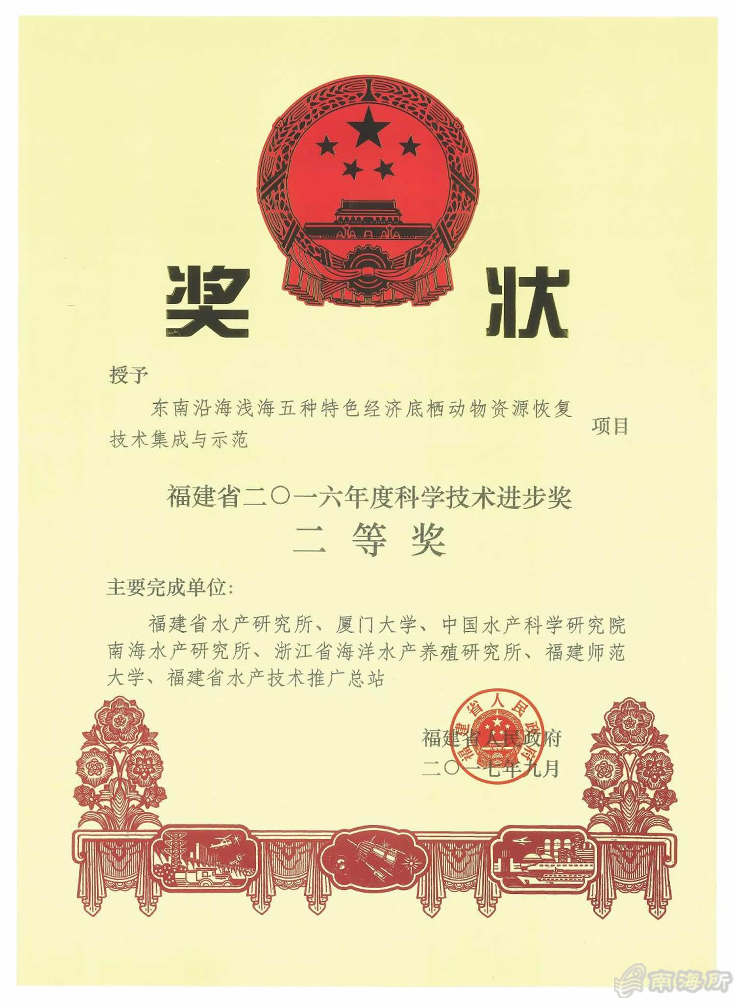 “东南沿海浅海五种特色经济底栖动物资源恢复技术集成与示范”获2016年福建省科学技术进步奖二等奖?br>