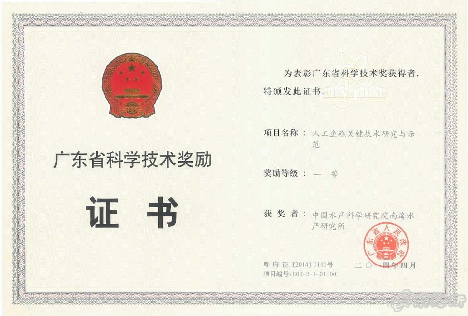 “人工鱼礁关键技术研究室示范”获2014年广东省科学技术奖励一等奖?/p>
