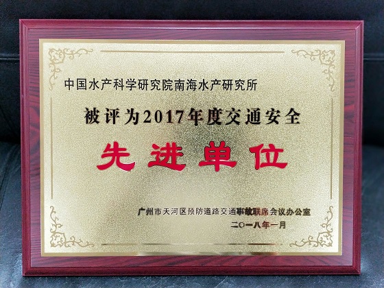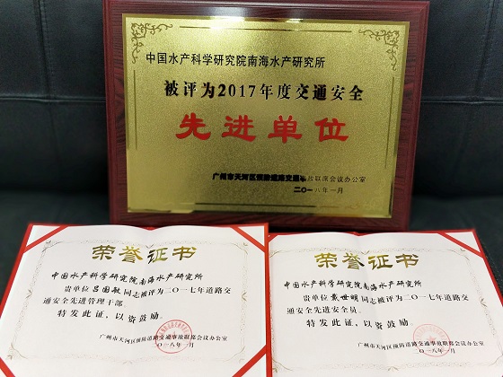 近日,从广州市公安局交通警察支队天河片?017年度工作会议上传来喜讯,中国水产科学研究院南海水产研究所被授?017年度“交通安全文明先进单位”荣誉称号,这是南海所连续11年获此殊荣。同时,吕国敏同志被评为?017年道路交通安全先进管理干部”,戴世明同志被评为 ?017年道路交通安全先进安全员”?/P>