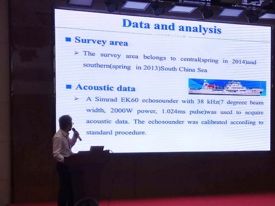 与会专家围绕声学技术(SGAT)、理论与目标强度(SGTS)、声学探测(SGES)、声学应用(SGAA)、生态系监测(SGEM)等主要议题展开学术探讨。张俊在会上以“A preliminary study on NASC and distribution of mesopelagic fishes in the central-southern area of South China Sea”为题作了英文报告,介绍了中层鱼类在大洋生态系统中重要意义及其在南海的资源状况,并从南海中层鱼类的空间分布及其季节和昼夜变化规律、资源密度及其纬度差异、昼夜垂直迁移特征等方面交流了近年来南海中层鱼类的研究结果?/P>