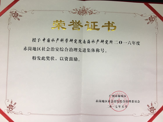 5?8日,广州市海珠区赤岗街道召开维护稳定及社会治安综合治理工作会议,?016年度社会治安综合治理工作先进集体、先进个人进行表彰。中国水产科学研究院南海水产研究所被评为?016年度赤岗地区维护稳定及社会治安综合治理工作先进集体”,李栩勤同志荣获?016年度赤岗地区维护稳定及社会治安综合治理工作先进个人”称号?/P>