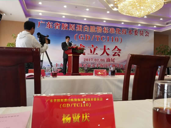 2017??日,广东省胶原蛋白肽粉标准化技术委员会(GD/TC 110)成立大会在汕尾市召开。广东省质监局副局长翁永卫、汕尾市副市长李贤谋和中国水产科学研究院南海水产研究所杨贤庆研究员及汕尾市五丰海洋生物科技有限公司等“政产学研用”单?0余人参加了会议?/P>