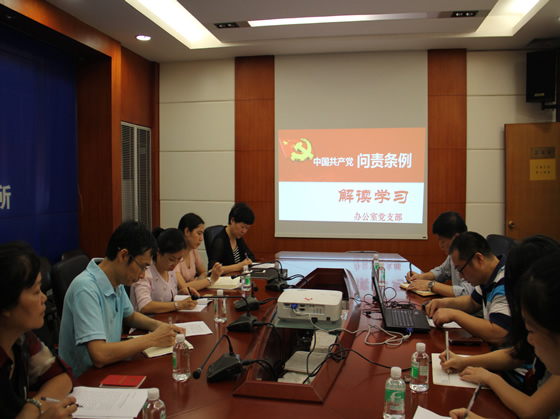 会上,张旭丰首先结合PPT图片,从背景介绍、制定过程、四大亮点、条例说明等方面对《问责条例》进行了分析解读,随后和支部党员一起对《问责条例》全文逐条进行了学习。大家联系各自工作实际,分享了学习心得和体会,一致认为党中央制定《问责条例》,是全面从严治党的又一次制度创? 为进一步严肃党内政治生活、净化党内政治生态提供了重要保障,纷纷表示要把学习贯彻《问责条例》与岗位职责、工作实际紧密结合,与“两学一做”学习教育紧密结合,从自己做起,抓好落实、见诸行动,坚决维护问责制度的严肃性和权威性?/P>