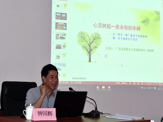 作为省直工委的领导和党建专家,钟国辉同志领导经验丰富、政治理论功底深厚,对党建有专门研究和独到见解。他以“心灵树起一座永恒的丰碑”为题,就“如何做一名合格的共产党员”给大家上了一堂精彩的“两学一做”专题辅导课,讲座内容丰富,讲解深入浅出,案例鲜活生动,集深刻的教育性、明确的实践性、具体的指导性于一体,得到了大家的一致好评?/P>