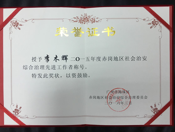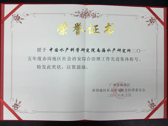 近日,广州市海珠区赤岗地区社会治安综合治理委员会召开会议,并?015年度社会治安综合治理工作进行表彰。中国水产科学研究院南海水产研究所被评为?015年度赤岗地区社会治安综合治理工作先进集体”;后勤处处长李木辉同志被授予?015年度赤岗地区社会治安综合治理先进工作者”称号?/P>