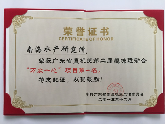 日前,自11?9日开幕的广东省直机关第二届趣味运动会圆满结束。中国水产科学研究院南海水产研究所工会组织30多名干部职工参加了此次运动会,并取得“万众一心”项目第1名的好成绩,充分展现了南海所人健康向上、团结进取、奋力拼搏的精神风貌?/P>