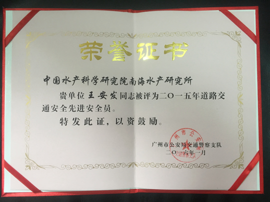 近日,从广州市公安局交通警察支?015年度工作会议上传来喜讯,中国水产科学研究院南海水产研究所被评?015年度“交通安全文明先进单位”,这已是南海所连续9年获此殊荣,王安发同志被评为广州?015年度“道路交通安全先进安全员”?/P>